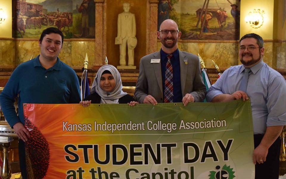 Newman University attended the KICA Student Day at the Kansas State Capitol on Feb. 13, 2017. The event is sponsored by the Kansas Independent College Association (KICA). It is an opportunity for independent colleges all across Kansas to lobby and gather interest for themselves and speak to state legislatures. Representing Newman University at the event were students Jacob Hobbie, Hibah Ullah, James Leggett, and Dean of Students Levi Esses.