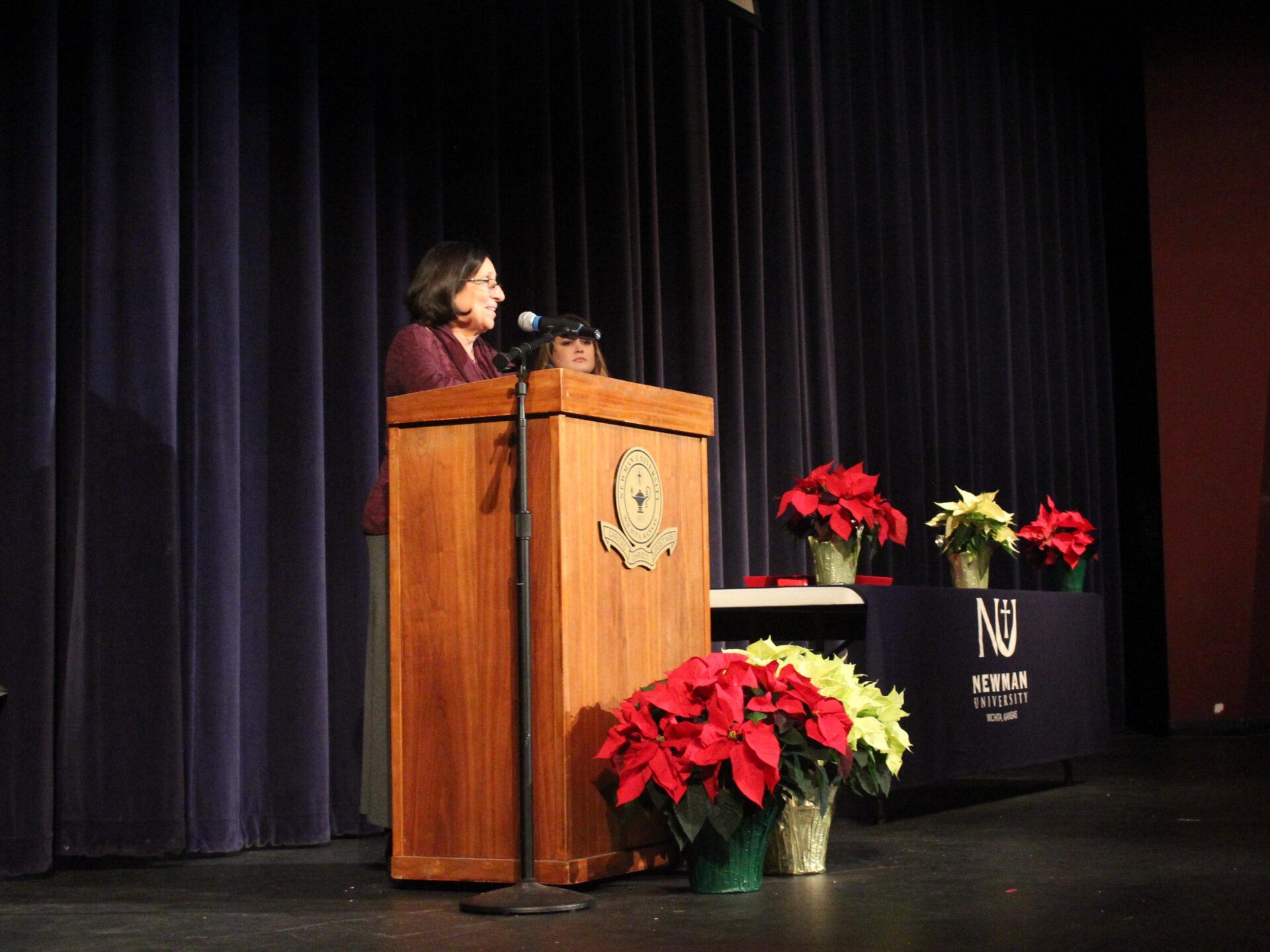 Norreen welcome President Noreen M. Carrocci, Ph.D., welcomes attendees to the fall 2018 Nursing Pinning Ceremony.
