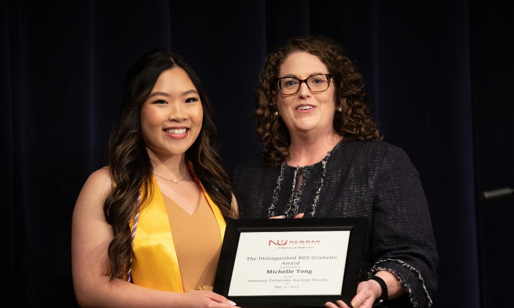 4 (From left to right) Michelle Tong receives the 2023 Distinguished BSN Nursing Award from Geri Tyrell, dean of the School of Healthcare Professions.