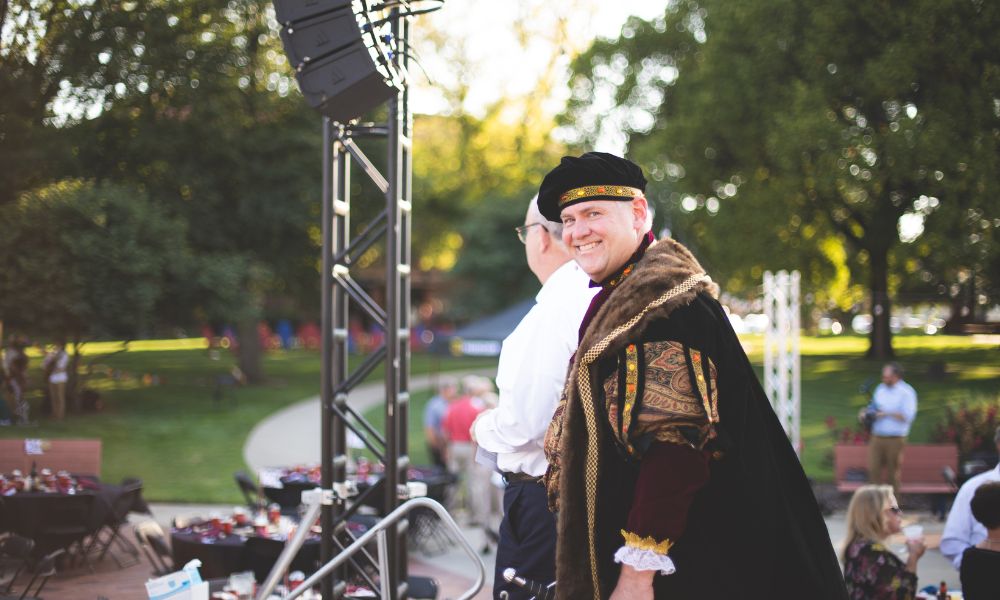 Klaus smiles in Renaissance attire during Party on the Plaza in 2021.