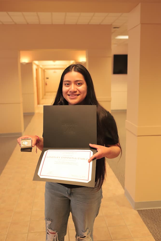 Lindsay Espinosa-Pablo holds the St. Catherine’s Medal. Espinosa-Pablo holds the St. Catherine's Medal.