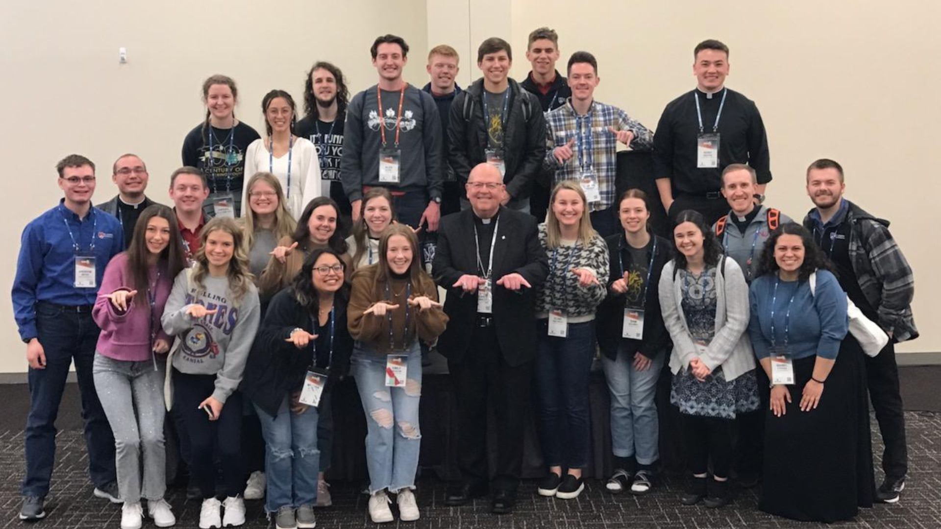 2 Students of Newman University and Wichita State University show off their Jet hands with the Most Rev. Bishop Carl A. Kemme.