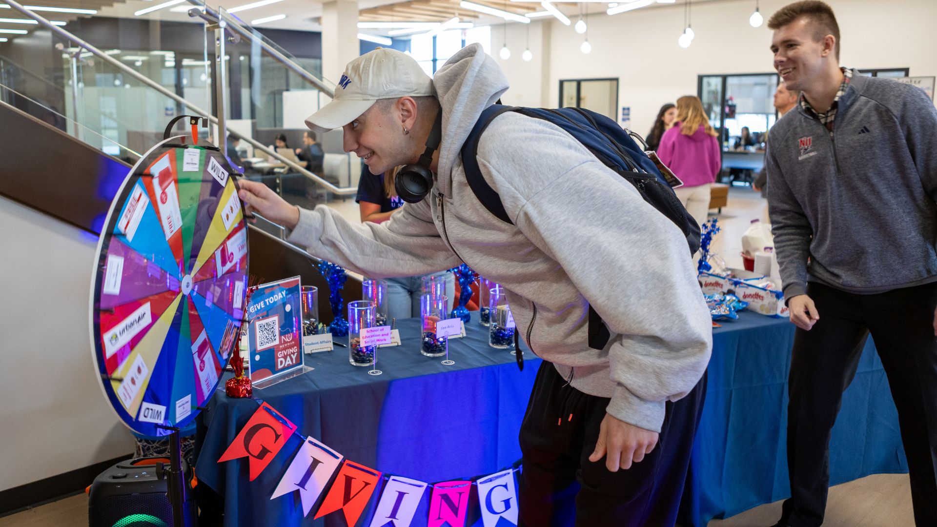 A student spins the wheel of prizes at the student booth for making a donation during Giving Day.