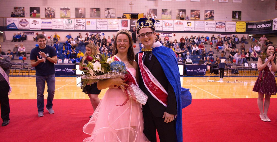 During halftime at the men’s game, the red carpet was rolled out and the court was introduced. Then the big announcement happened. The 2017 Newman University Homecoming King and Queen are Luke Sponsel and Ellise McGowan.