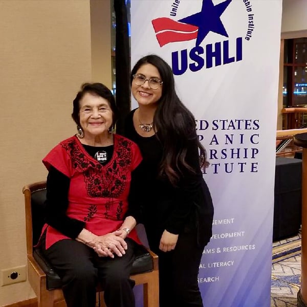 Ariana Esparza poses with Dolores Huerta at a Hispanic leadership conference.