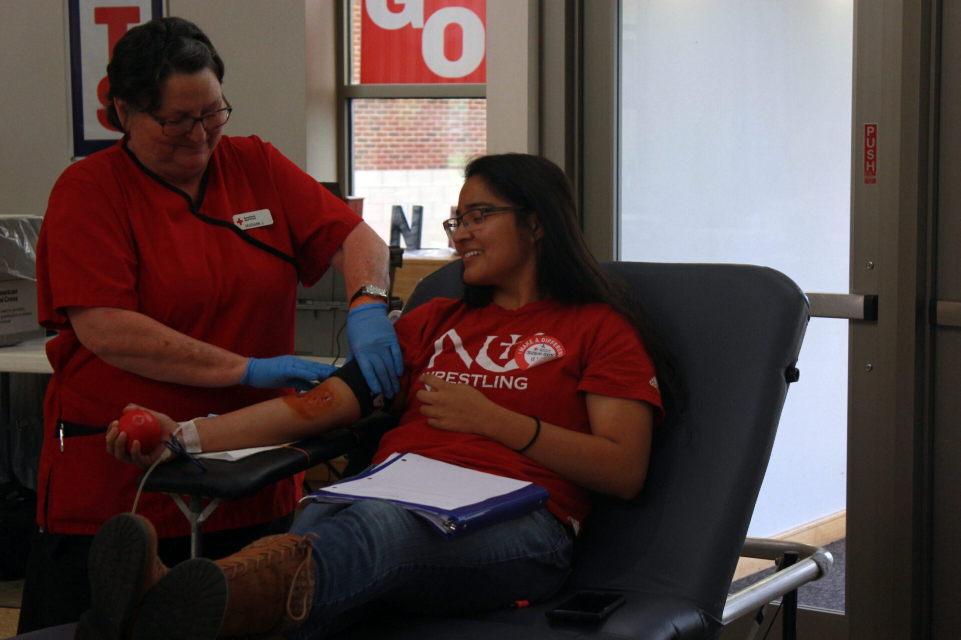 A student is prepped for her donation