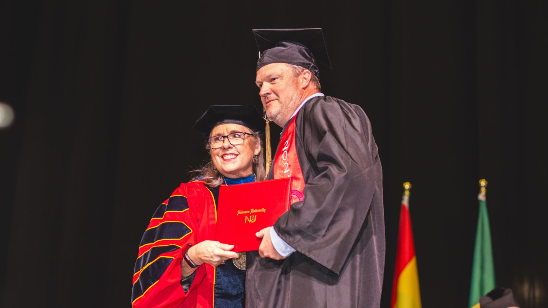 2 Coach Billy Murphy received his college diploma from President Kathleen Jagger during Newman University commencement day.