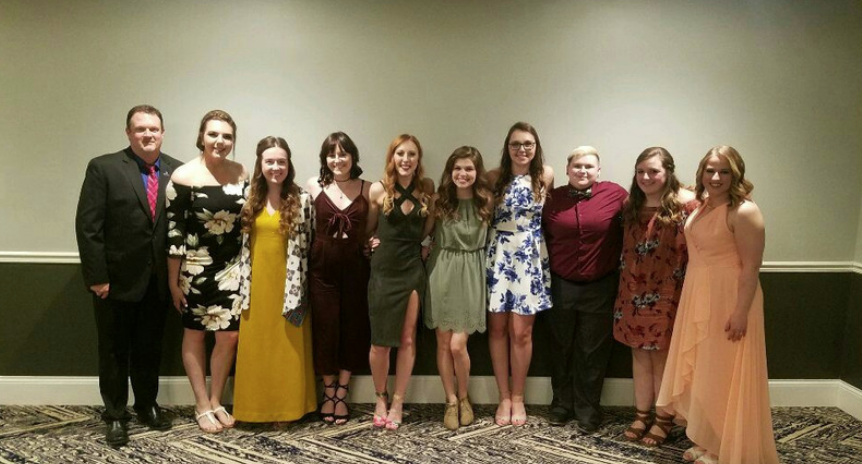 Lady-Bowling-With-Coaches Coach Murphy (far left) and Coach Brooks (far right) pose with the 2017-2018 women's bowling team at the Banquet of Champions.