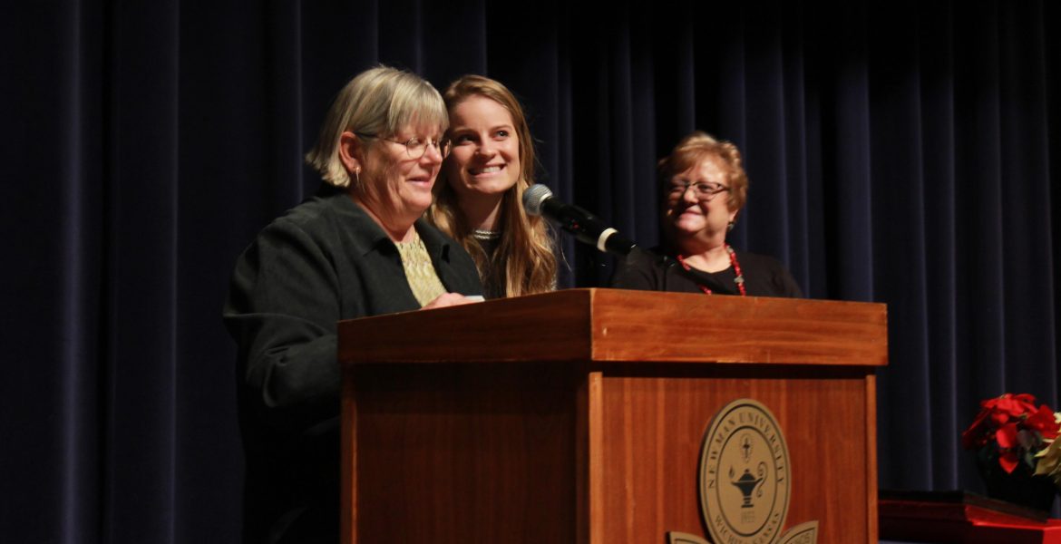 Distinguished BSN award recipient Anna Burton (center) poses with Newman University President Noreen M. Carrocci, Ph.D., (left) and Director of Nursing Teresa Vetter, M.S.N. (right).