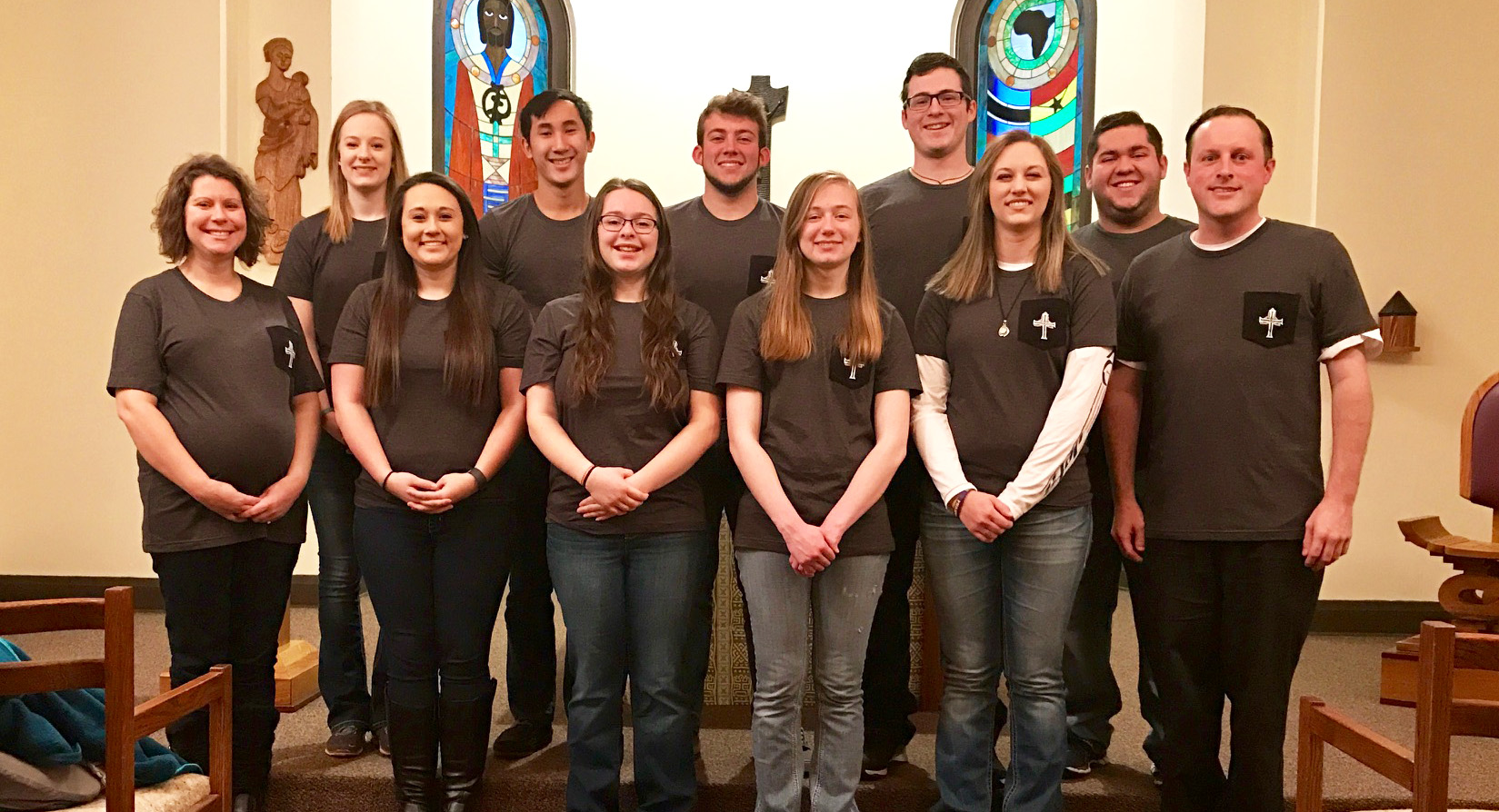 Ministry Winter Trip 2017 uttm cover L-r, front row: Monica Borger, Angela de Souza, Brigette Sponsel, Christine Wolf, Kylie Werth, Fr. John Fogliasso. Back row: Ellen Kurtzweil, Victor Phan, Alec Hampton, Luke Sponsel, Dominic Bacha.