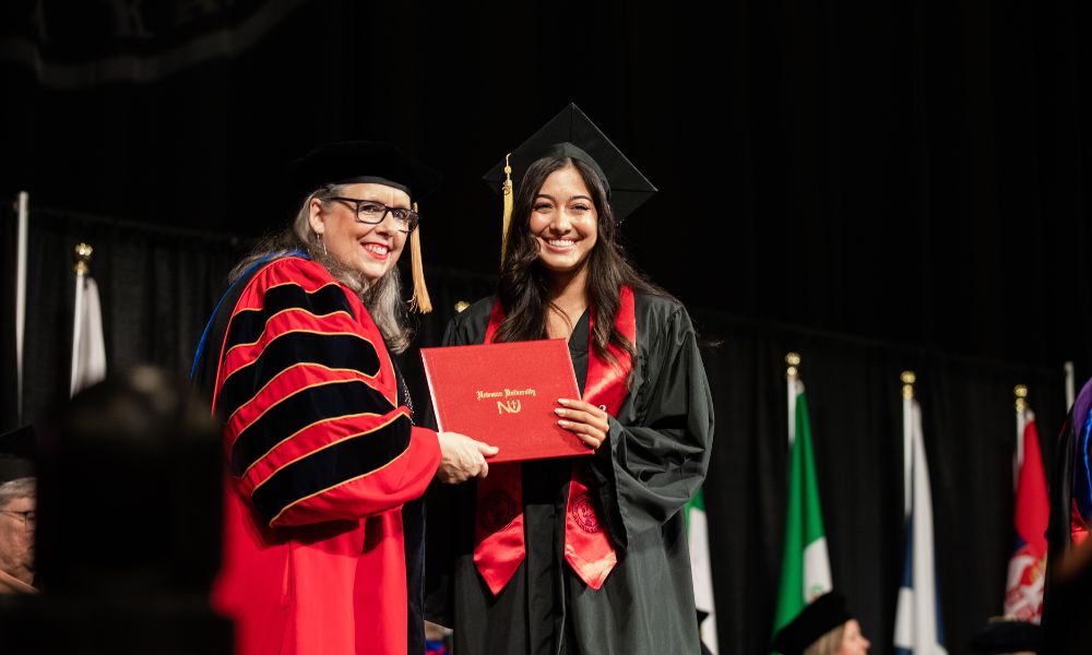 President Kathleen Jagger smiles for a photo with a 2023 graduate.