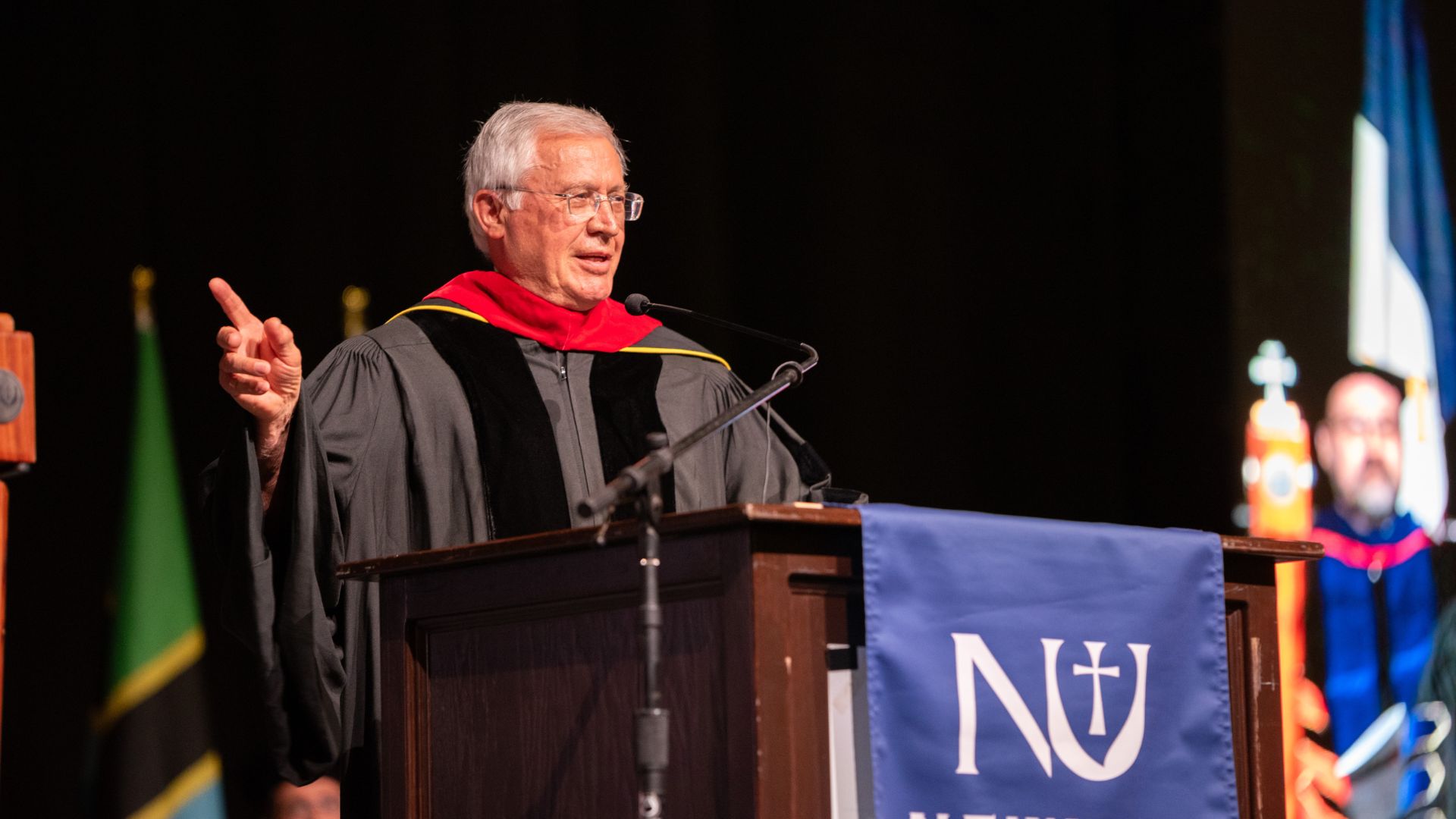 Father Tom Welk gives his commencement address to Newman University graduates on May 10.