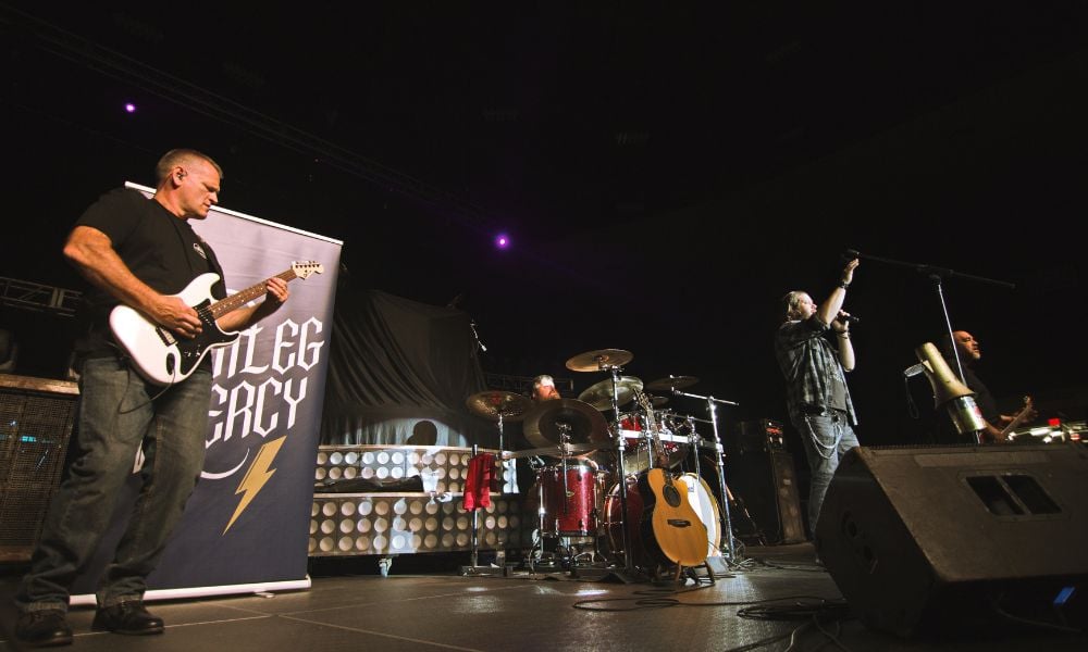 Nightingale (left) plays guitar during a concert with fellow members from his band, Bootleg Mercy.
