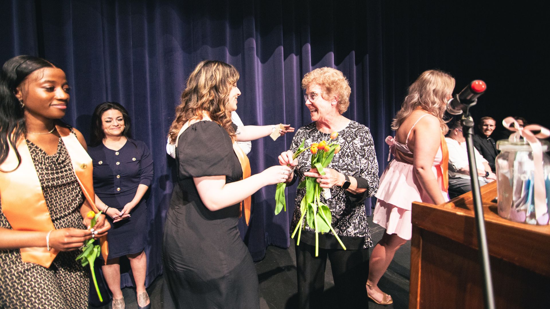 Strickert receives flowers from the graduating Newman University class of 2024.