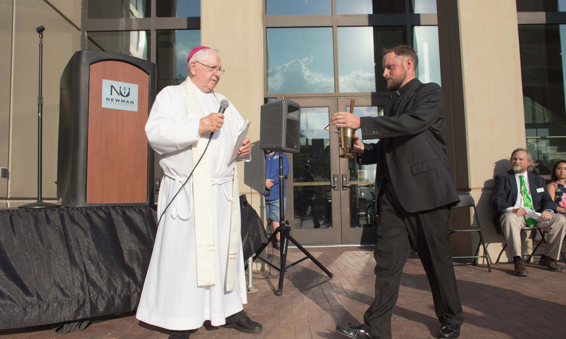 Bishop Gerber and Father John Fogliasso at the dedication of the science center.