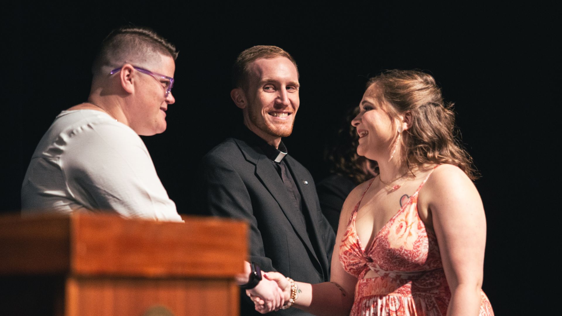 Clarkson (left) congratulates a student during the May 2024 Newman nurse pinning ceremony.