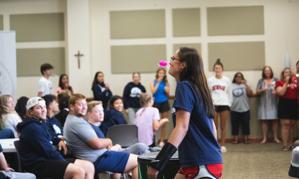 3 Students, Newman faculty and staff played games during breakfast Friday morning in the Dugan-Gorges Conference Center.