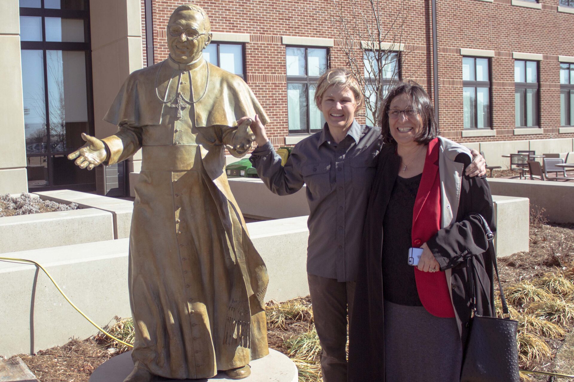 Gerber Sculpture 1a President Noreen M. Carrocci, Ph.D. (right) poses with artist Lori Norwood and the Bishop Gerber sculpture.