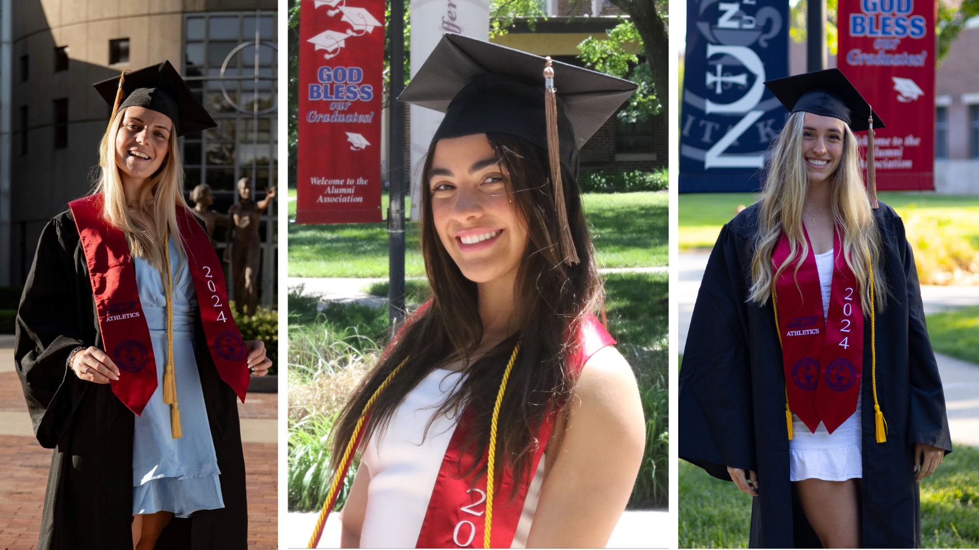 Graduate assistants story From left to right: Brunet, Morales and Weaver in graduation attire at Newman University.