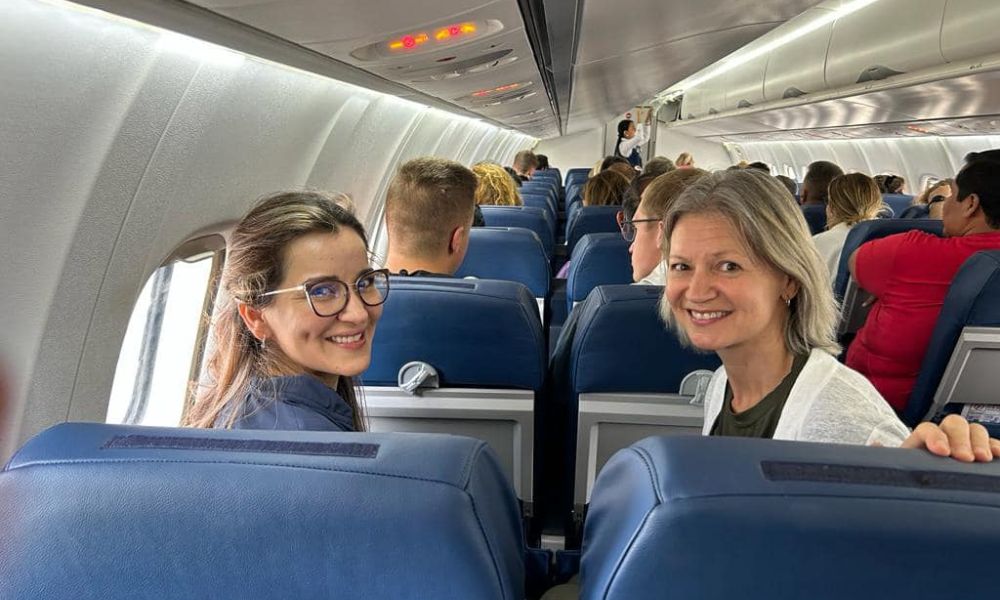 Professors Cinthia López and Sonja Bontrager smile on the plane to Guatemala.