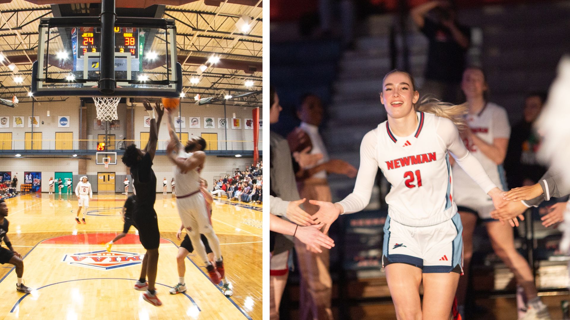 Homecoming Men's team scores a basket, women's player Valeriya Lioukina high-fives teammates as the Jets enter the court.