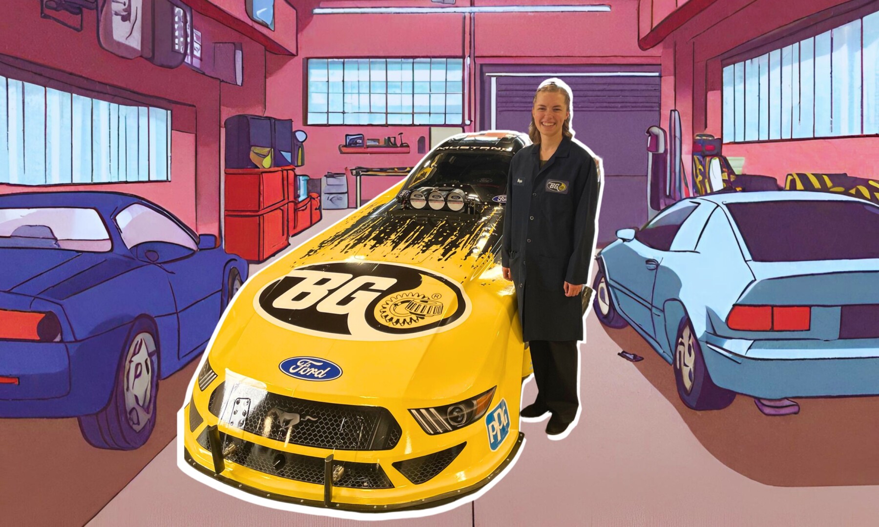 Hope Strickbine stands with a BG Products car and illustrated background.