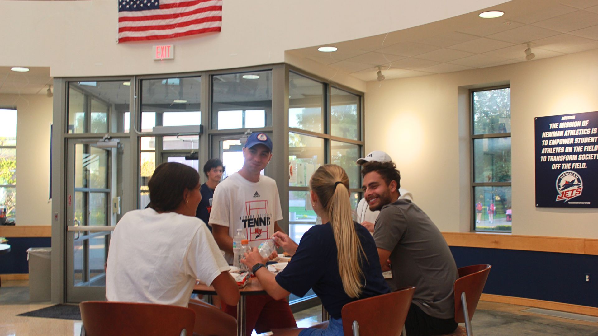 Students chow down on grilled hamburgers and hot dogs during the international student mixer.