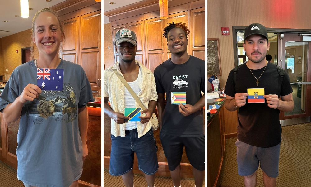 2 Newman students hold up flags of their home countries at the international student mixer held Aug. 29.