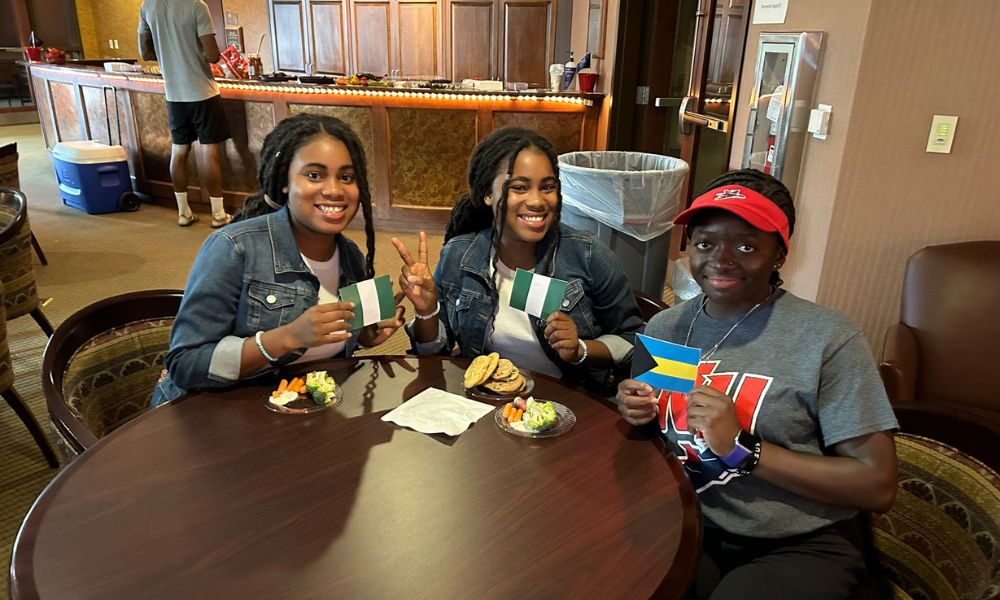 Twins Tryphena and Tryphosa Kayode hold up their home country flags along with Smith.