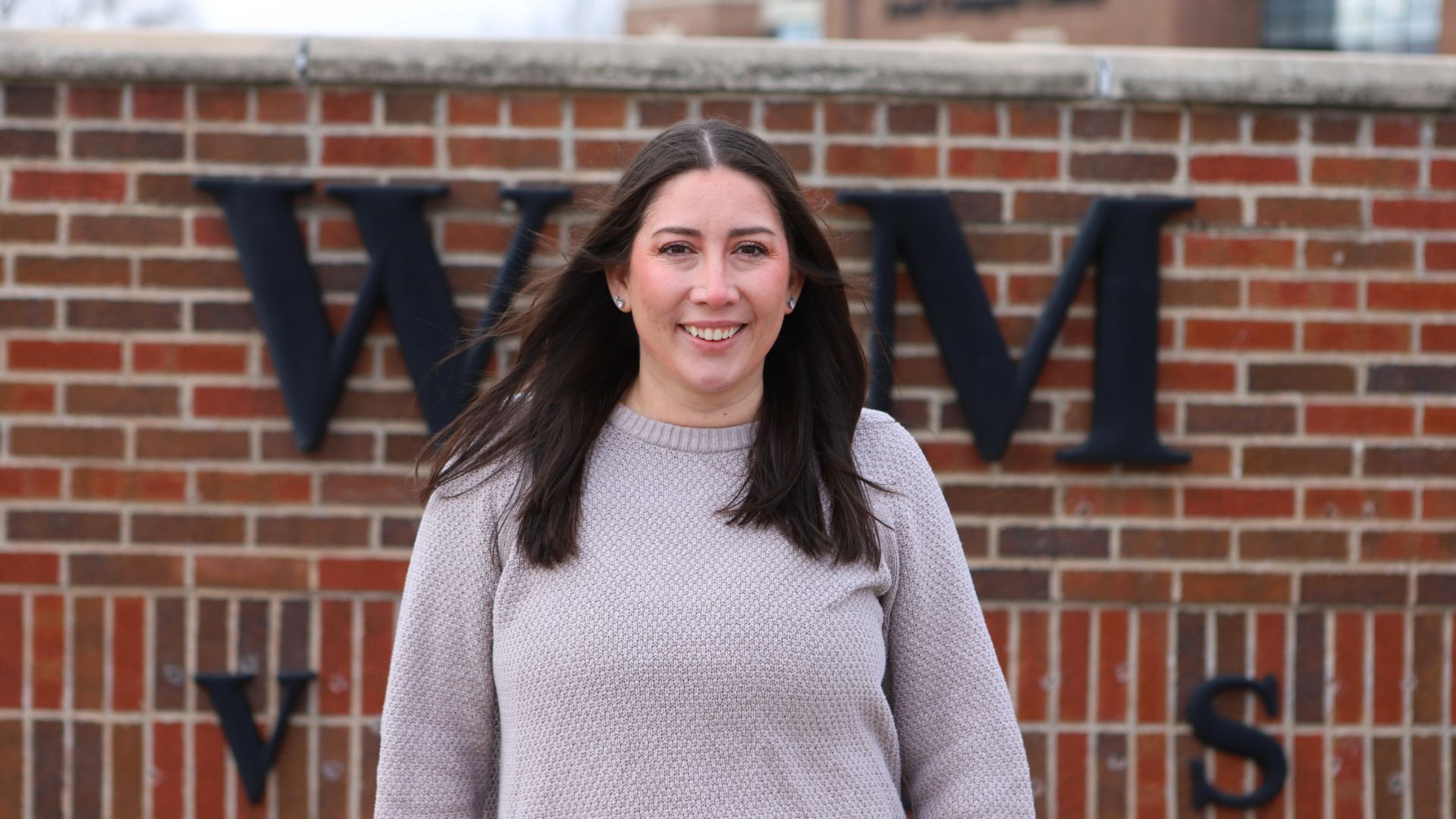 Jami Turnquist stands in front of the Newman University sign on campus.