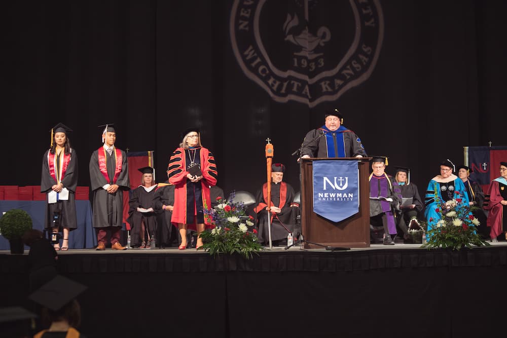 (From left to right) Kelly Mai and Steven Nguyen receive the 2022 Newman Ablah Awards from President Kathleen Jagger and VP of Academic Affairs Alden Stout during commencement on May 6.