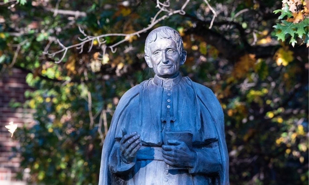 A St. John Henry Newman sculpture is located outside Sacred Heart Hall.