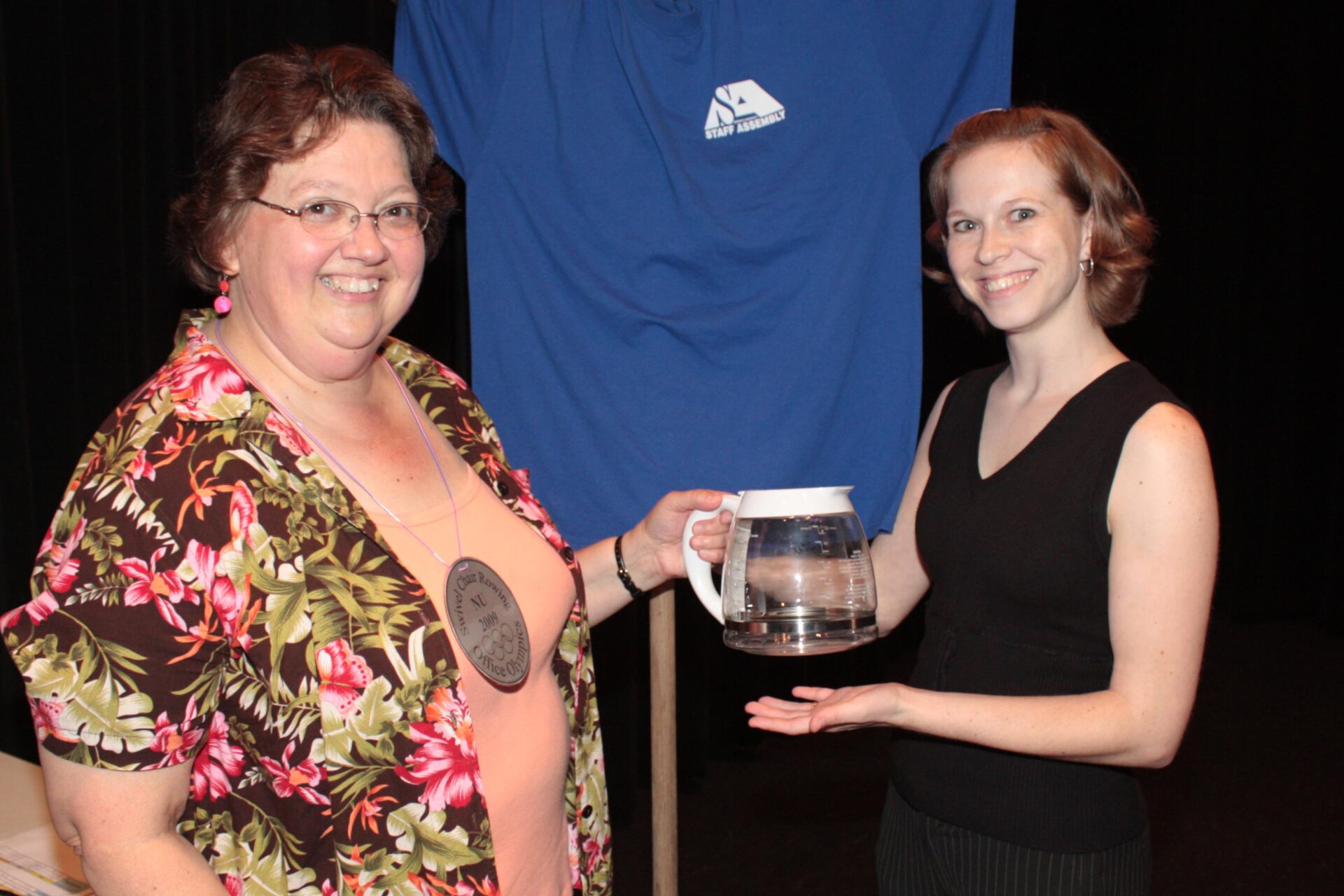 Linda_Amy_2009 Staff Assembly President Linda Sabala "passes the torch" (coffee pot) to the new 2009-2010 president Amy Larrea.