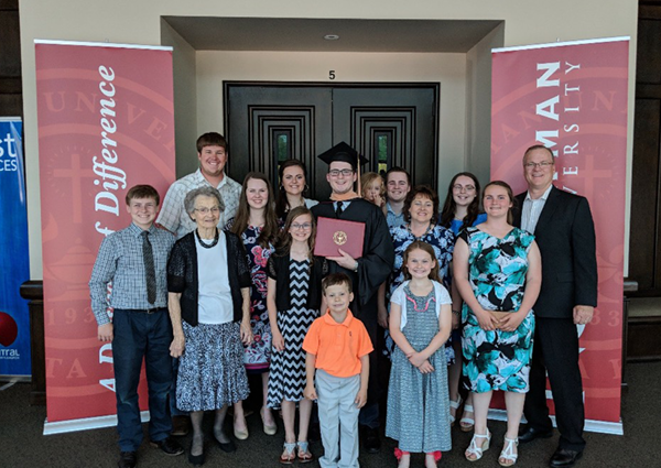 Sponsel and fam 2 Luke Sponsel at his Newman University graduate commencement ceremony with family, many of whom attended Newman as well.