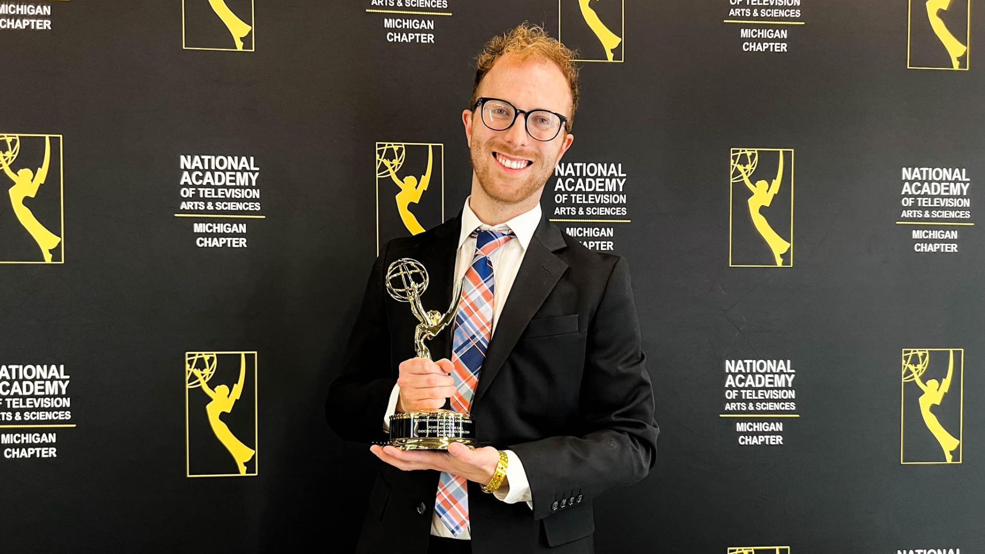 1 Riedl with his Emmy Award for his "Portraits of the Call" video project with the Diocese of Lansing in Michigan.