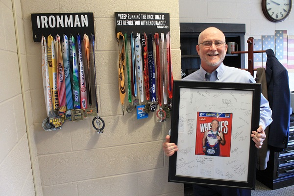 Andrews displays his finishing medals from past races in his McNeil Hall office.