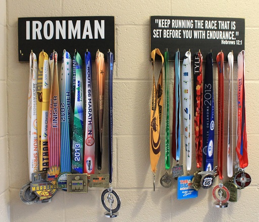 medals Just above Andrews' medals, he displays a quote: "'Keep running the race that is set before you with endurance,' Hebrews 12:1."