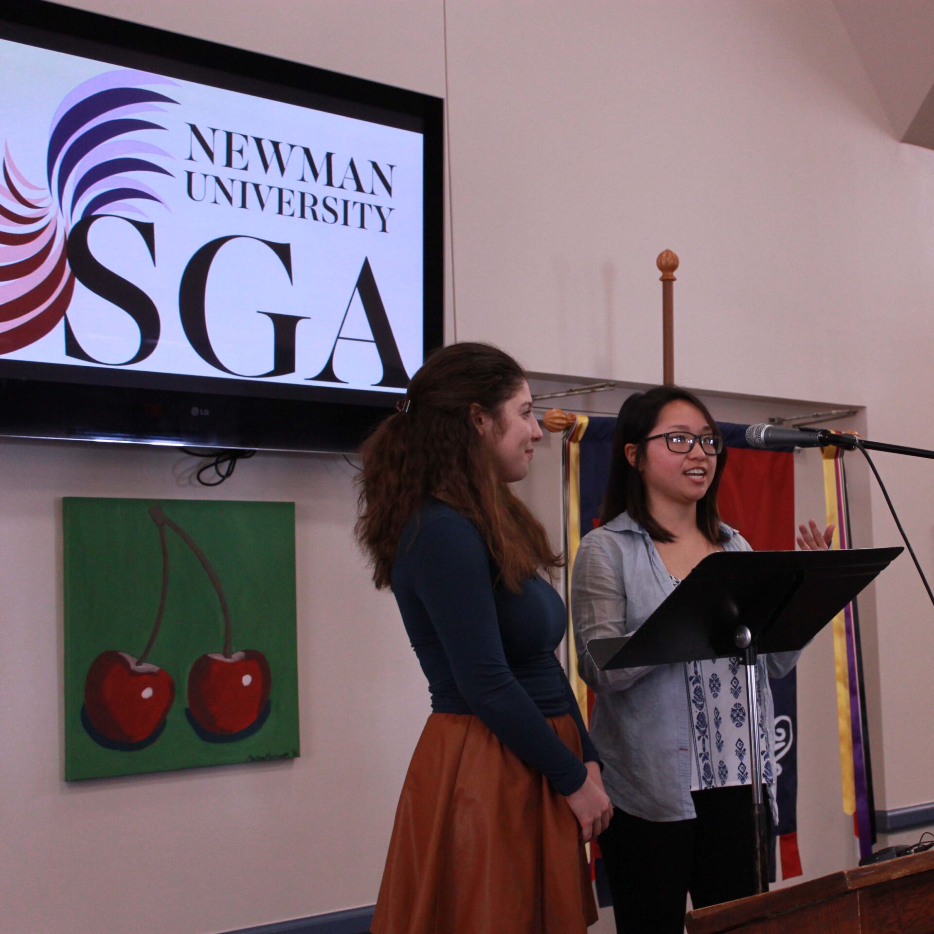 Nicole Zayat and Vivian Hoang talk to an audience at the SGA debate.