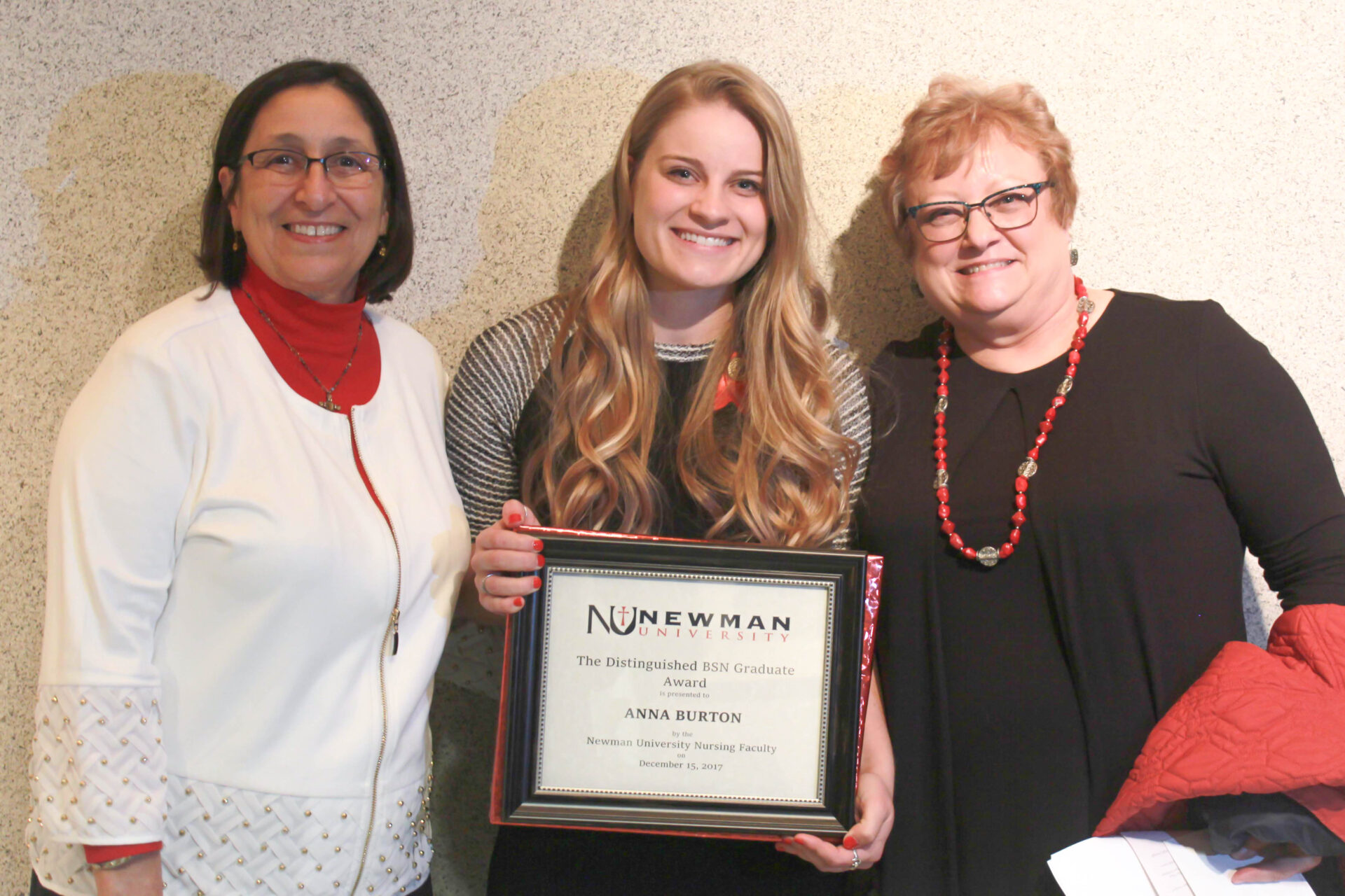 Burton_Carrocci_Vetter_b Distinguished BSN award recipient Anna Burton (center) poses with Newman University President Noreen M. Carrocci, Ph.D., (left) and Director of Nursing Teresa Vetter, M.S.N. (right).