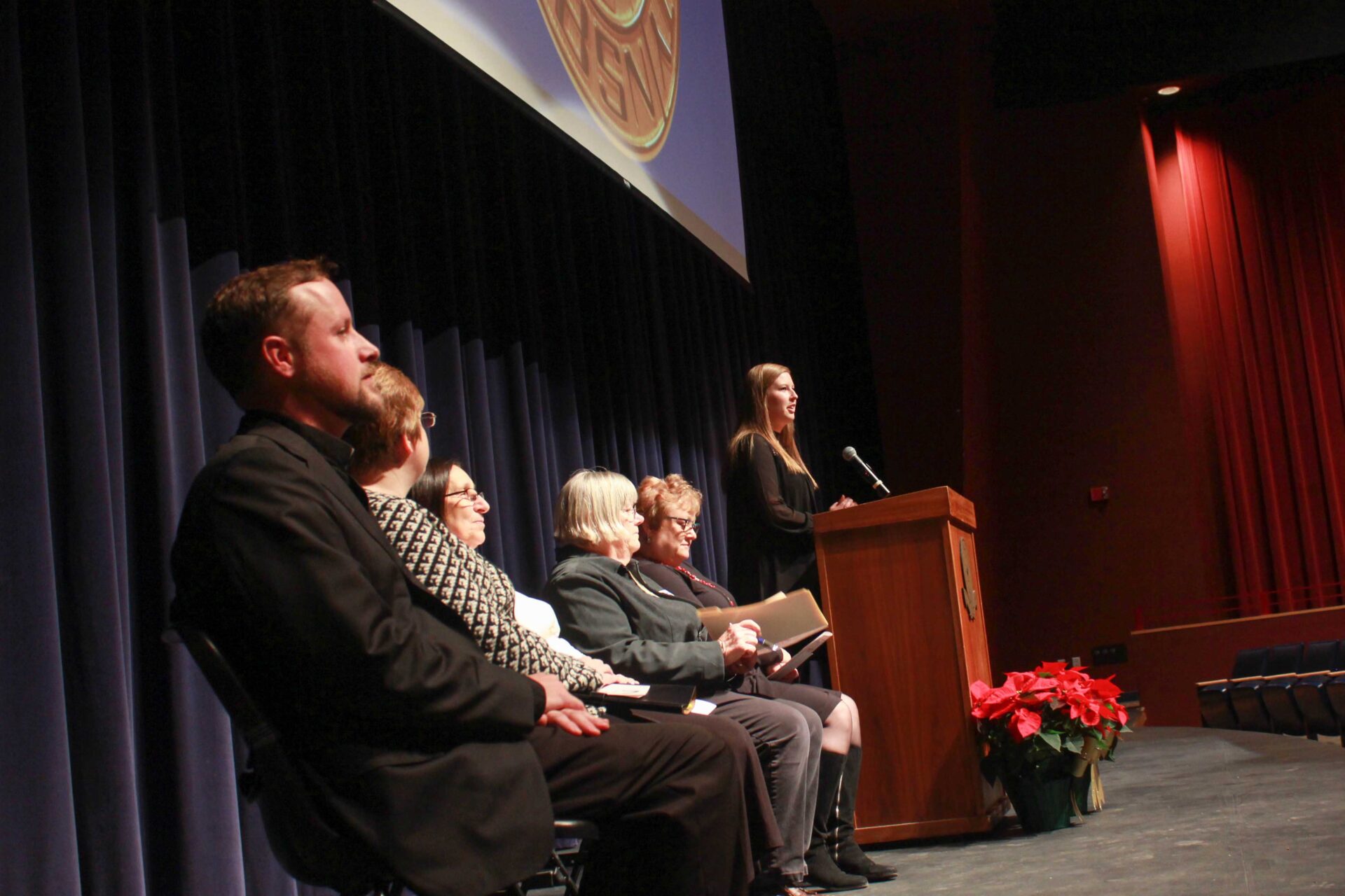 Mackenzie_Wills_Speaking_a Mackenzie Wills offers greetings to those attending the fall 2017 Nursing Pinning Ceremony.