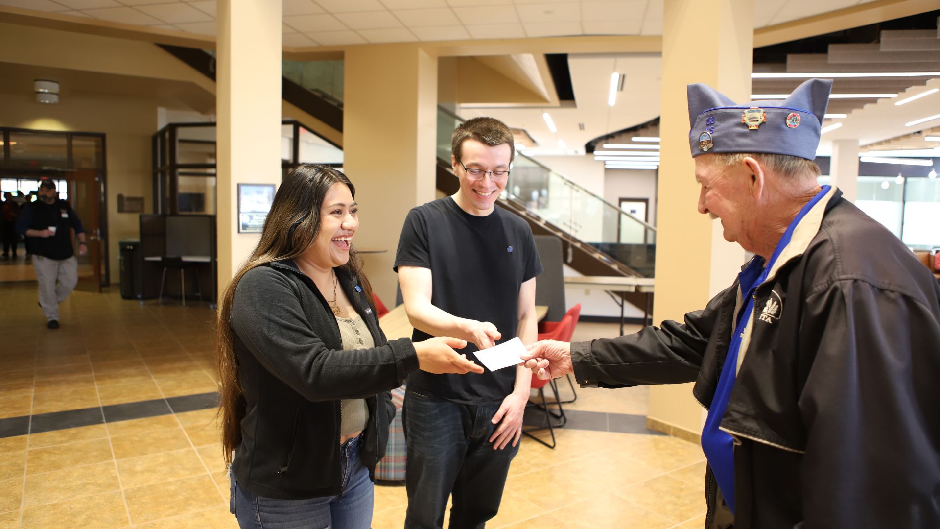 2-3 Lindsay Espinosa-Pablo and Brandon Welch accept a scholarship check from veteran Fred Howard on behalf of the 40&8 Military Honor Society.