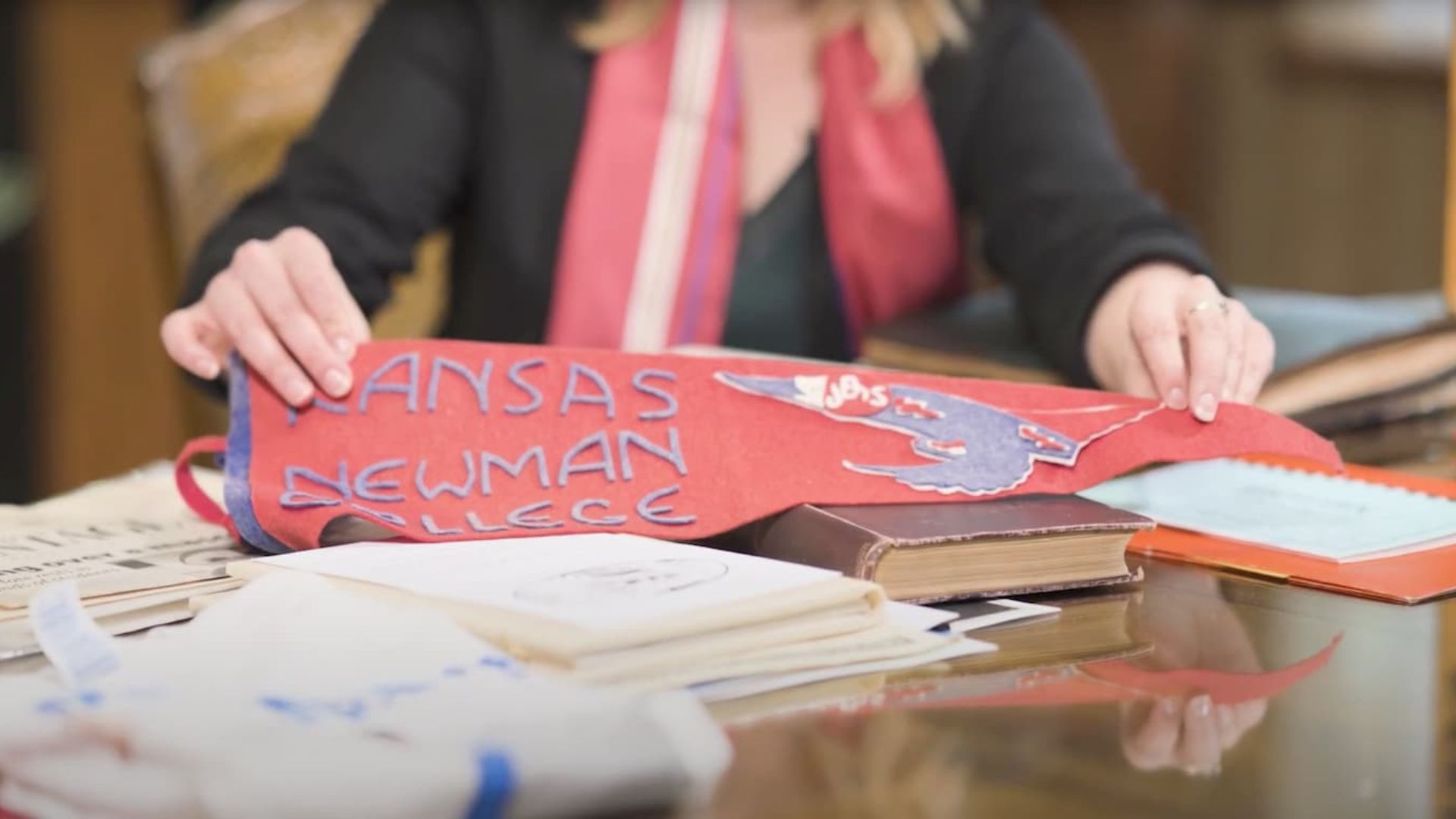 Stanley holds up a Newman pennant displaying the original Jet Bird logo design by Blackbear Bosin.