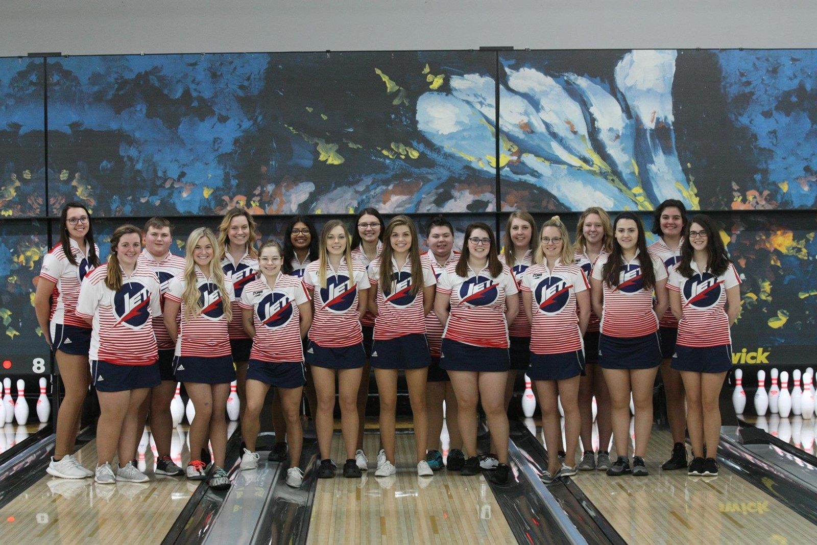 Andrea Wickstrum (Front row, 3rd from left) stands with her Newman bowling team.