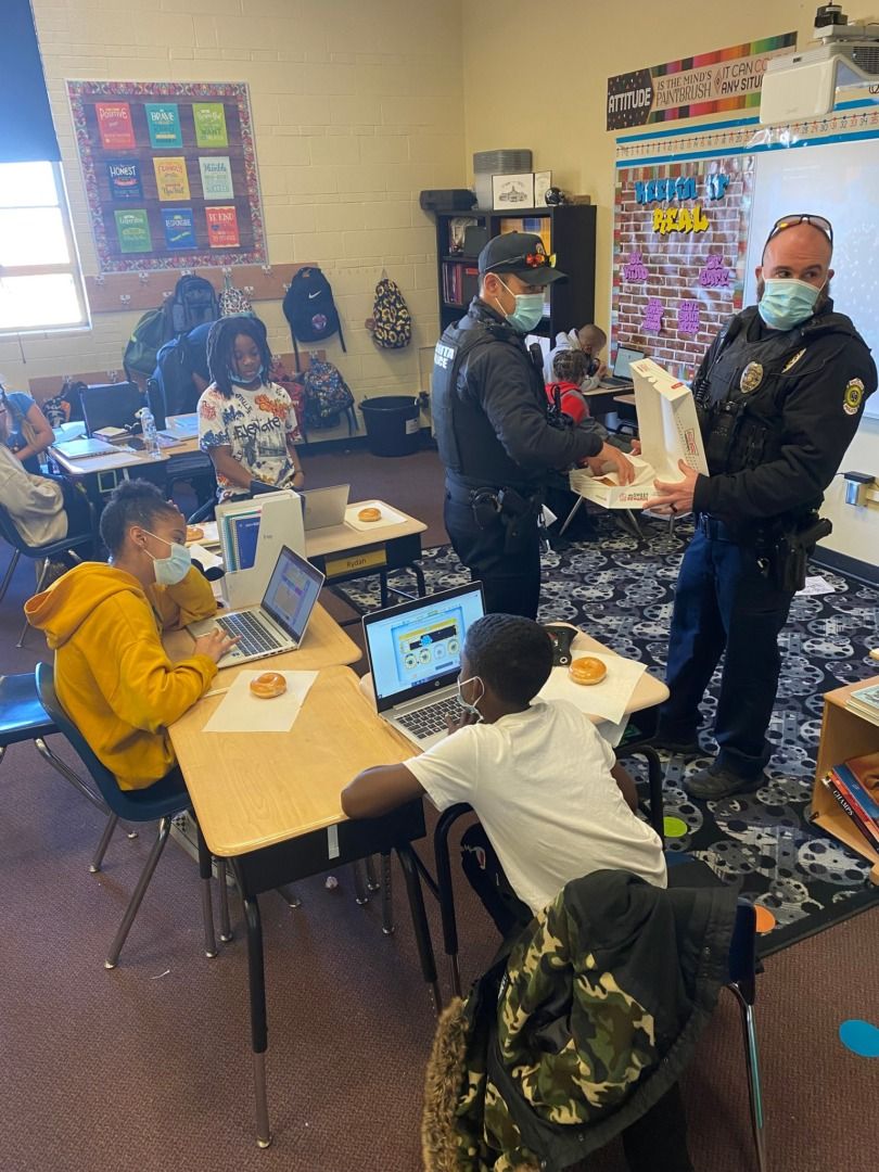 Newman alumnus and Officer Kristopher Gupilan hands out donuts to Wichita elementary students. Newman alumnus and Officer Kristopher Gupilan hands out donuts to Wichita elementary students.