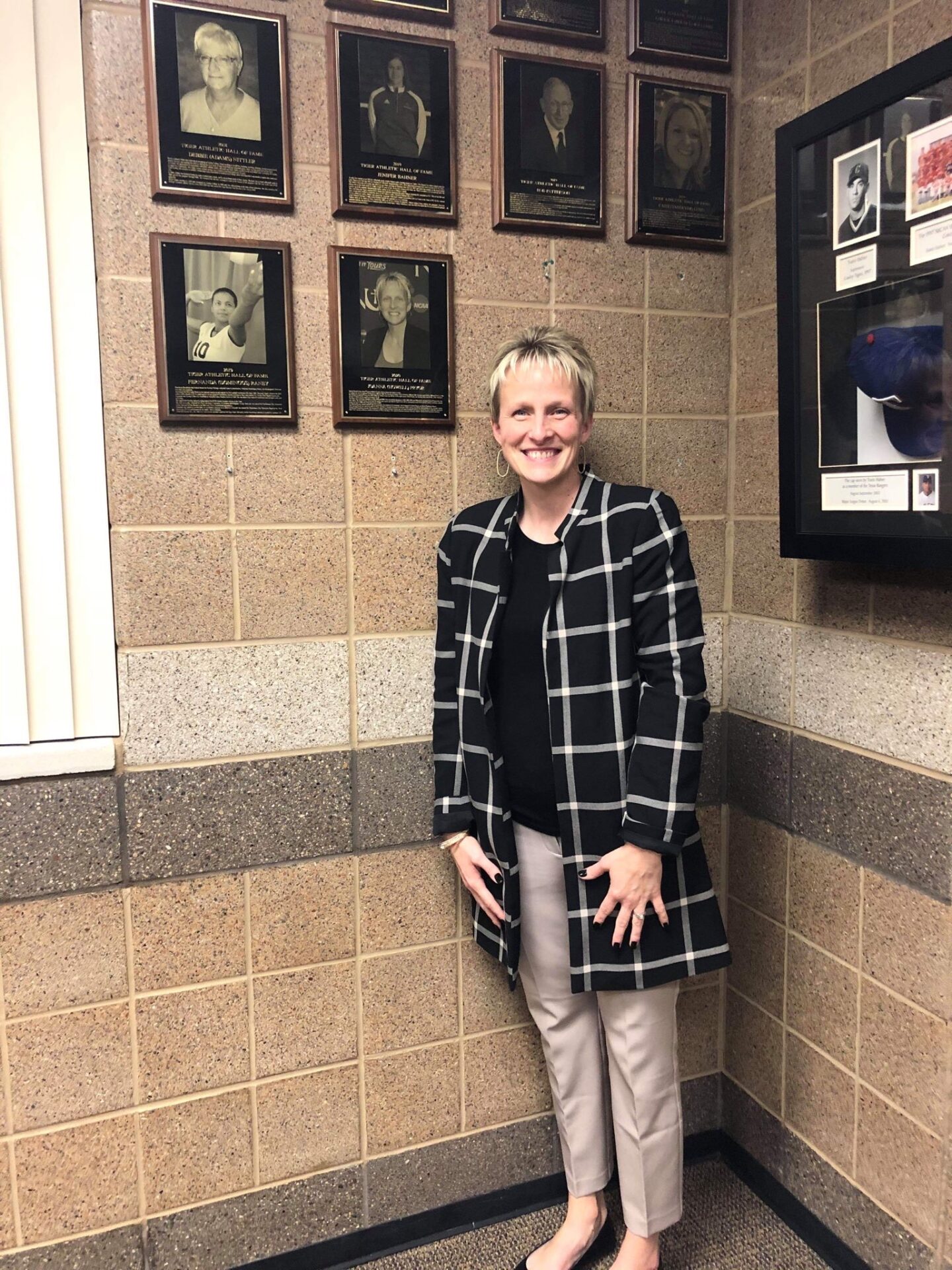 Pryor stands next to her plaque in the Cowley College Hall of Fame
