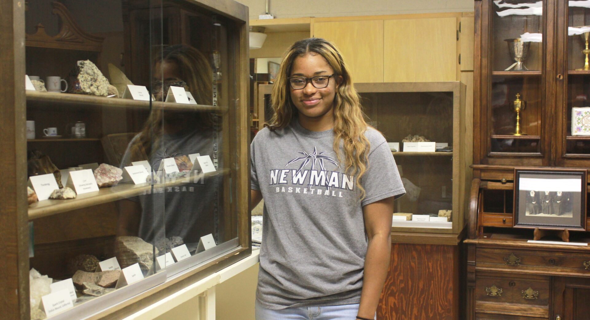 Nia Roberts with rocks Nia Roberts stands next to one of the bookcases she filled during her work on the rock project.