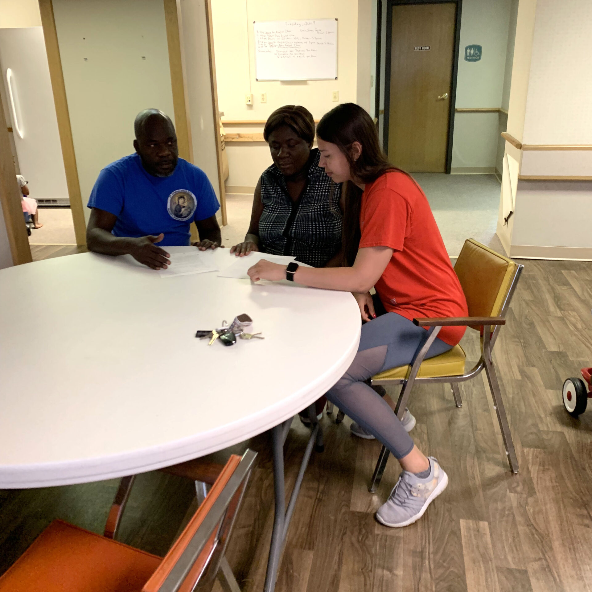 Carolina Bianchi helps refugee family at ASC Bianchi reviews some paperwork with two of the family members hosted by the ASC.