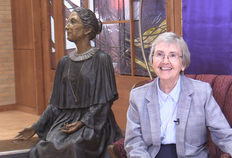 Screen Shot 2018-08-27 at 2.26.15 PM Sister Mary Kevin, ASC, sits beside the sculpture of Newman University foundress, St. Maria De Mattias, in the gathering space outside of the chapel.