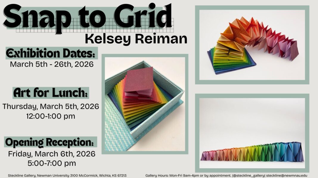 The Steckline Gallery will present “Snap to Grid,” an exhibition of prints and artist books by Kelsey Reiman, during a First Friday exhibition from 5–7 p.m. March 6 at Newman University.