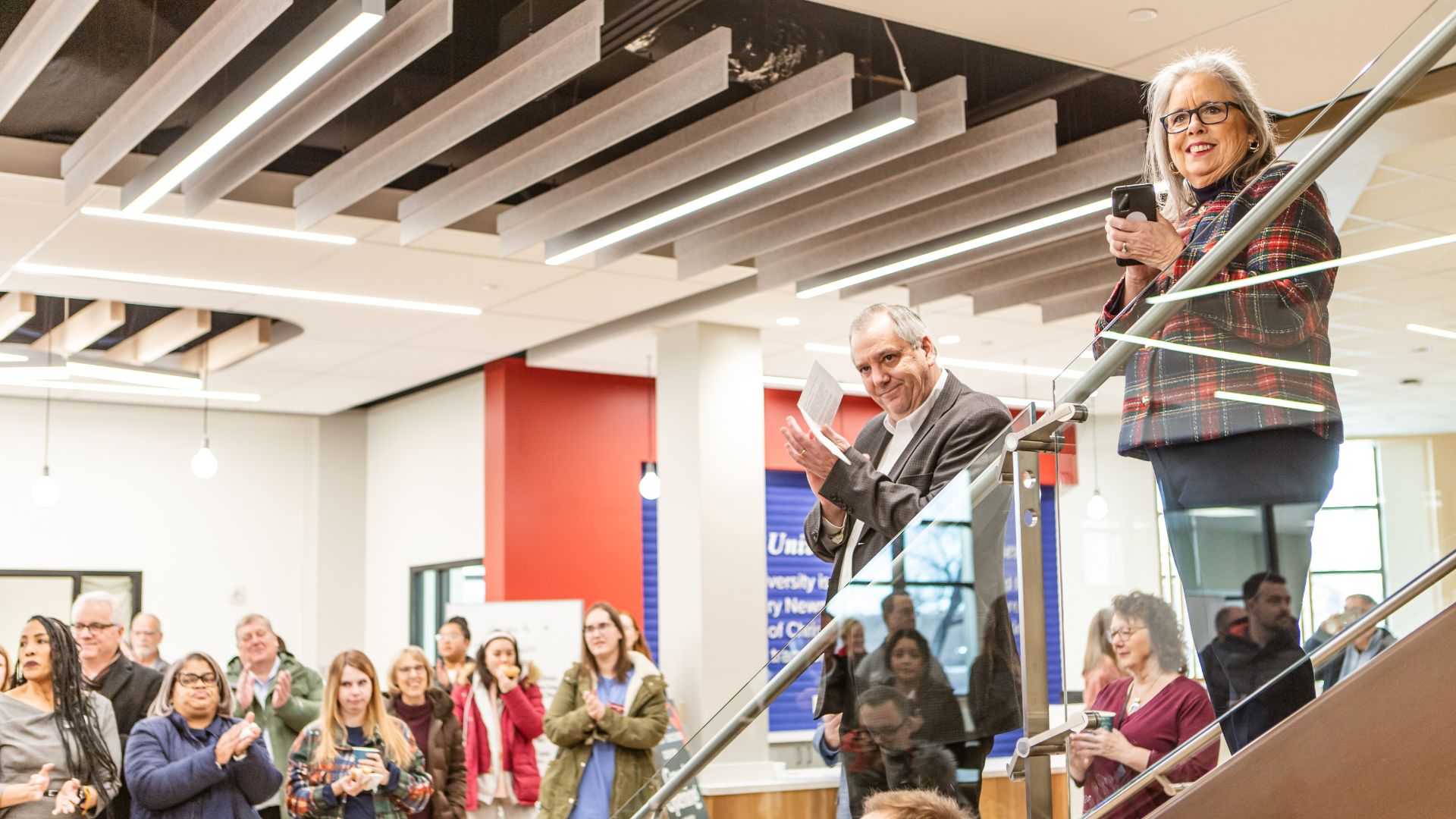 3 Vice President of Institutional Advancement Bob Beumer and President Jagger applaud donors, staff and all who played a part in making the Student Success Center possible.